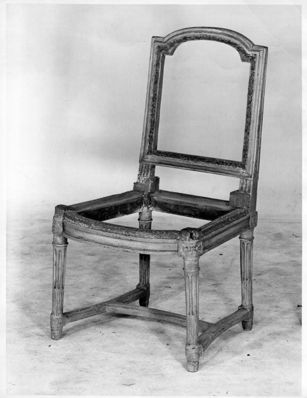 Inscrite à l'inventaire annexe du Mobilier national, le 10 juin 1931, dans une suite de quatre présente au ministère de la Guerre, hôtel de Brienne, 14 rue Saint-Dominique, Paris 7e arr. (Arch. Mob. nat., MM6471, f° 34 v°, n° 269). Parmi les quatre chaises, trois sont estampillées par Boulard.
