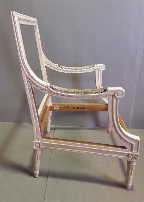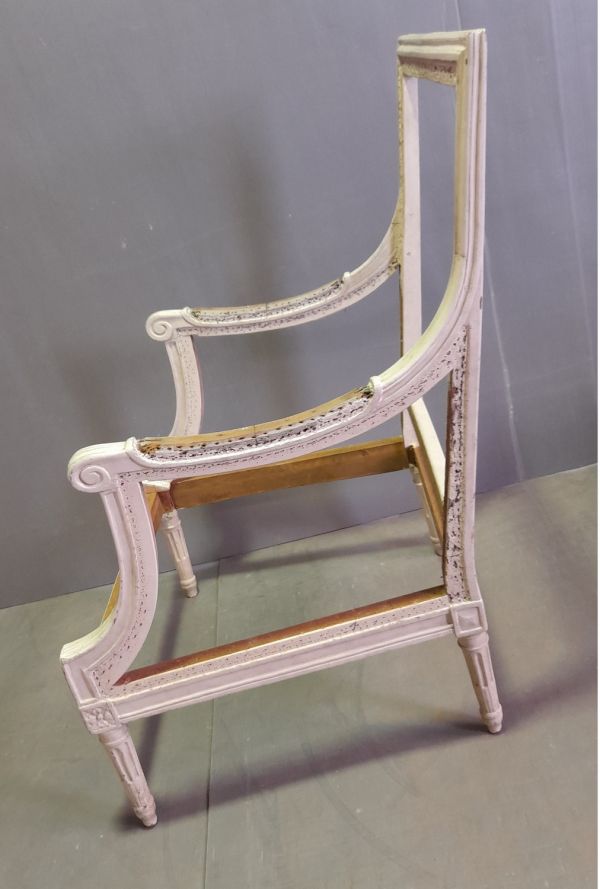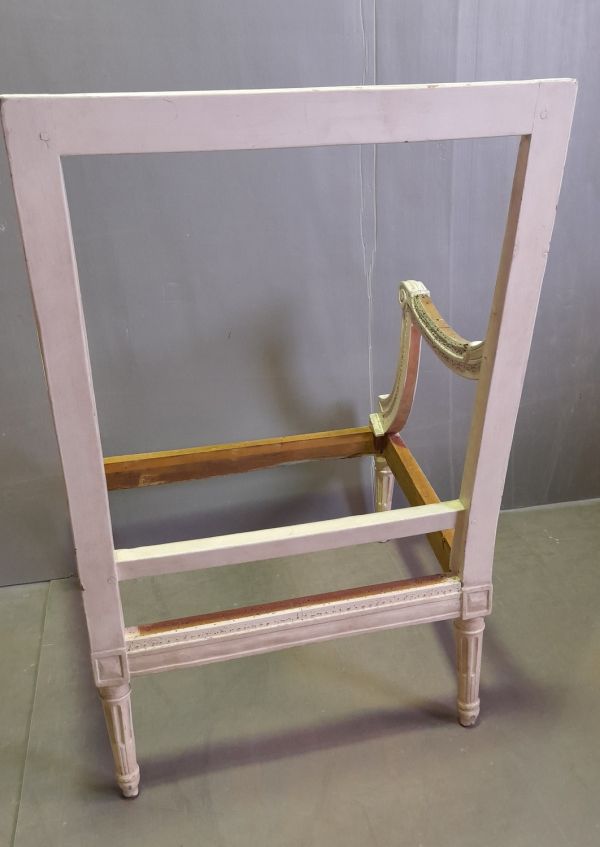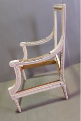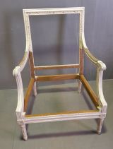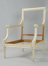 Bergère dégarnie , bois peint en blanc. Pieds droits, cannelés et rudentés, gainés, bagués. Supports d’accotoirs en cavet, nez d’accotoir à enroulement, accotoirs en doucine avec zones des manchettes. Dés de raccordement à fleurettes. Dossier rectangulaire et moulurés en listels.
