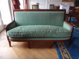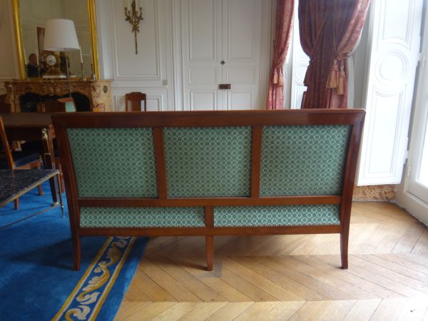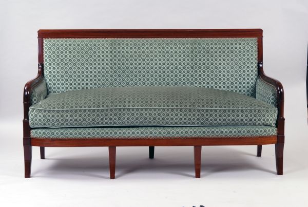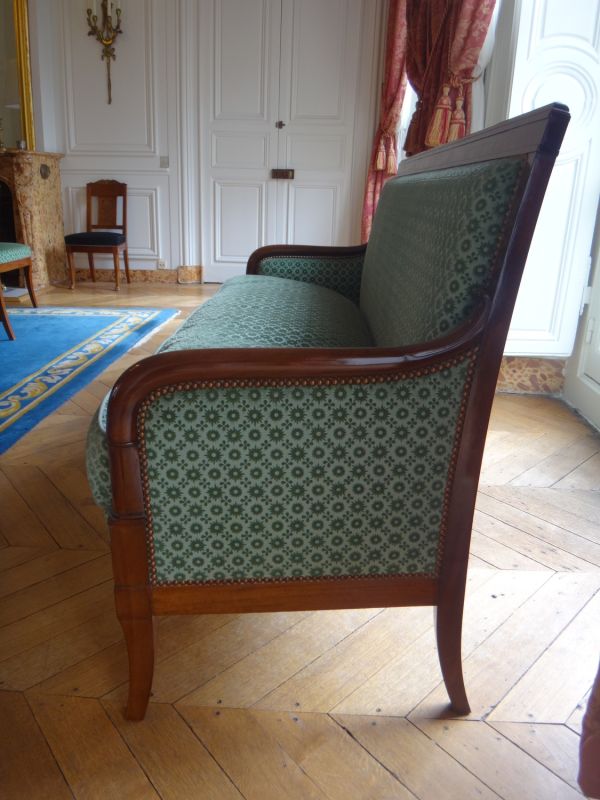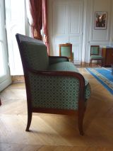 7 pieds sabre - 4 antérieurs et 3 postérieurs. Devanture convexe unie - Supports d'accotoirs tournés, cylindriques - Accotoirs en doucine cylindriques - Côtés garnis - Dossier rectangulaire, montants unis - Traverse supérieure à fond creux retourné - Fronton mouluré - Siège à épaisseur, dossier et côtés à pelote