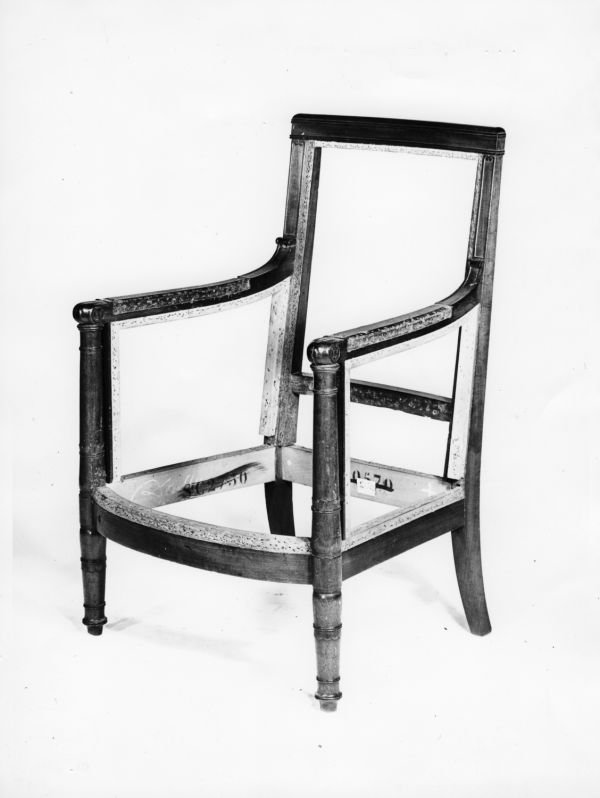Décrite en 1824 au palais de Saint-Cloud (STC 10570) ; en 1828, dans le salon de l'appartement du premier valet de chambre (AN, AJ/19/307, f° 159 v°, n° 2730) - l'ensemble de menuiserie comprend un canapé (n° 2729), deux bergères (n° 2730), six fauteuils (n° 2731), six chaises (n° 2732), deux tabourets de pieds (n° 2733) et un écran de cheminée (n° 2734) ; en 1833, dans le salon de l'appartement n° 35 (AN, A/19/320, f° 58 v°, n° 3234) - l'ensemble de menuiserie comprend un canapé (n° 3233), deux bergères (n° 3234), six fauteuils (n° 3235), six chaises (n° 3236), deux tabourets de pieds (n° 3237) et un écran de cheminée (n° 3238) ; en 1843, dans une paire, au magasin (AN, AJ/19/335, f° 41 v°, n° 15289).