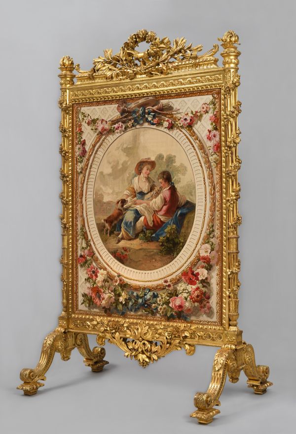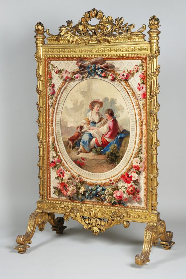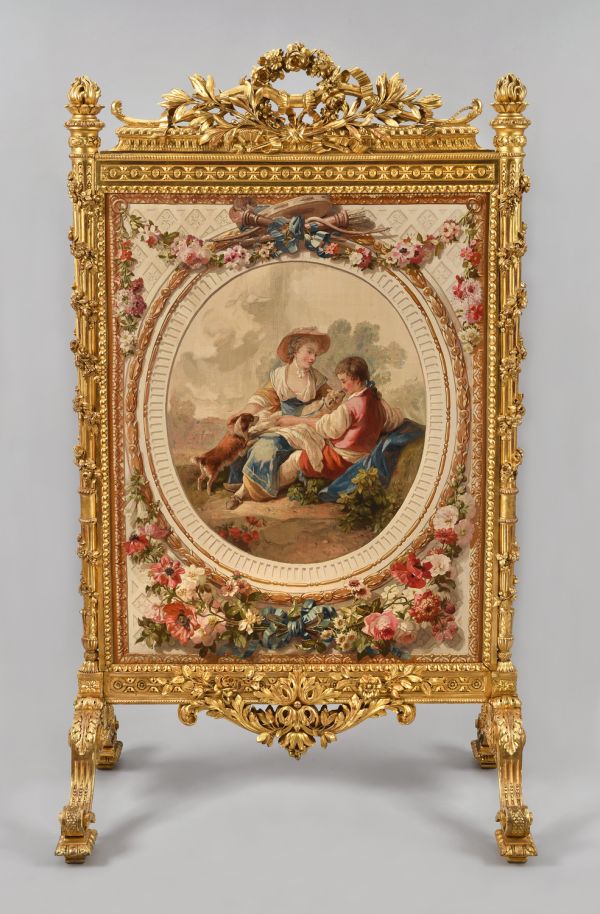 Tapisserie de Beauvais à fond blanc à camaïeu en diagonale bordé de moulures en or ciselé ; au centre, médaillon ovale cannelé à perles, pirouettes et lauriers or ; un berger et une bergère assis jouant avec un petit chien et un agneau. Au sommet et à la base à l'extérieur du médaillon, guirlande de fleurs rouges, roses et blanches à noeuds de rubans bleus, agrémentée au sommet d'un arc, carquois, torche et tambourin; entoilage en toile de soie Champagne plissée.