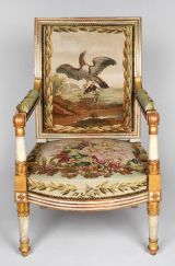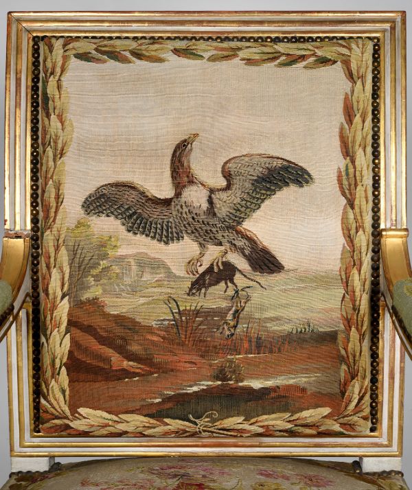 Tapisserie : au siège, 2 gerbes de feuilles de chêne, encadrent un bouquet de flurs multicolores ; au dossier, dans un rectangle de lauriers un paysage de rivière, un aigle s'envole, tenant dans ses serres un rat et une grenouille. Clous touchants
