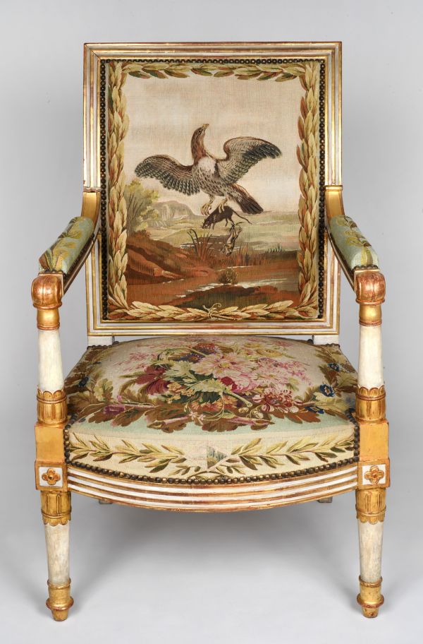 Fauteuil livré par François Maigret, tapissier et marchand de meubles, pour le premier appartement de prince au palais de Meudon. Il n’était alors pas recouvert de la tapisserie de Beauvais actuelle mais de l’étoffe à fond bleu et motifs de boucliers et d’abeilles livrée par Grand Frères.