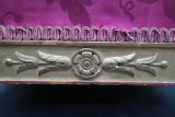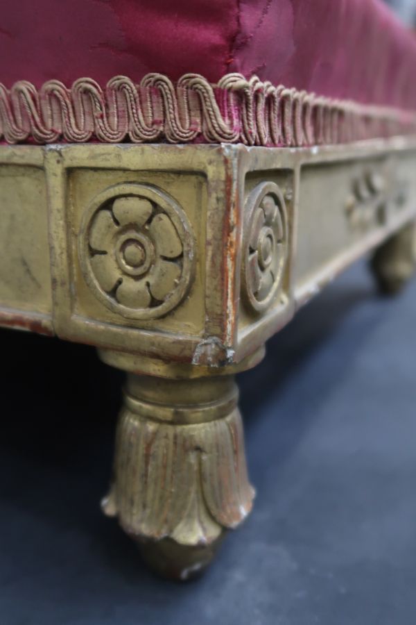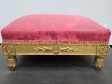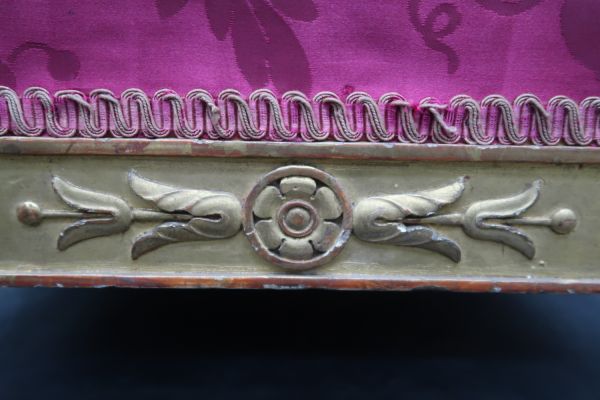 Bois doré. 4 pieds tournés en culot de feuilles nervées, renversées sur sabots coniques. Dés et ceinture à fond creux, rosace dans un cercle aux axes et aux dés, les centrales flanquées de double culot. Siège à épaisseur, sans ressorts. Damas rouge.