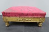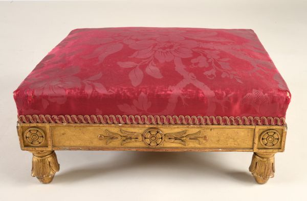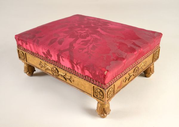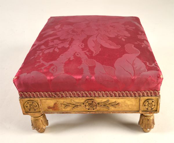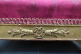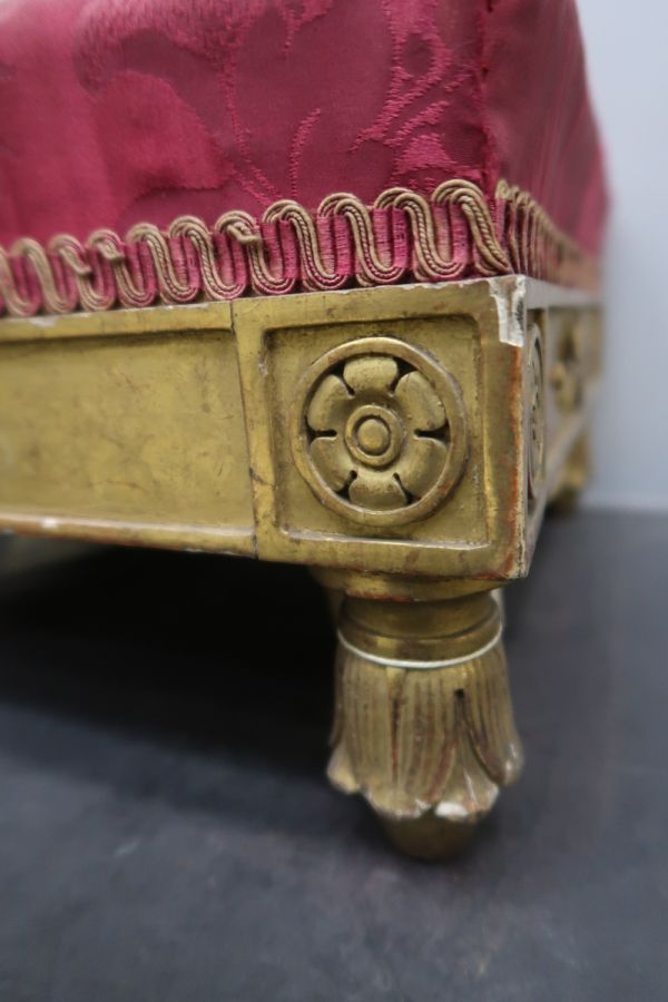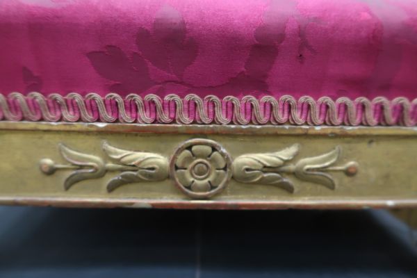 Bois doré. 4 pieds tournés en culot de feuilles nervées, renversées sur sabots coniques. Dés et ceinture à fond creux, rosace dans un cercle aux axes et aux dés, les centrales flanquées de double culot. Siège à épaisseur, sans ressorts. Damas rouge.