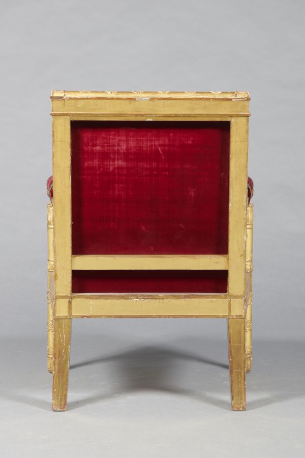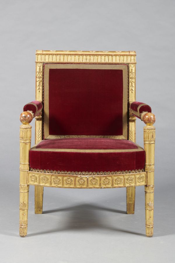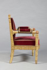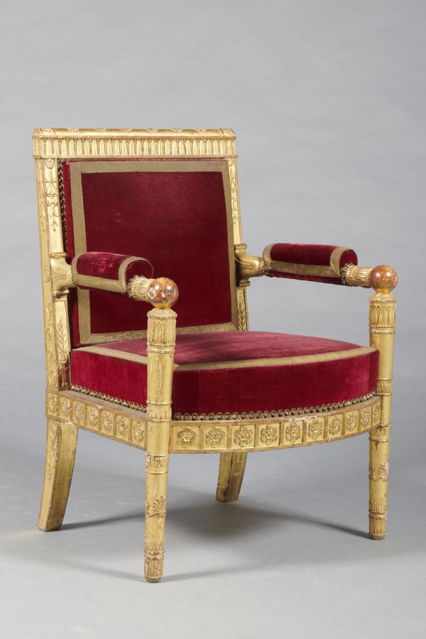 Fauteuil exécuté par la société « Jacob Desmalter et Cie », association de François-Honoré-Georges Jacob, dit Jacob-Desmalter (1770-1841), et de son père Georges (I) Jacob (1739-1814), menuisiers-ébénistes, active de 1803 à 1813.