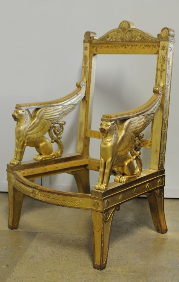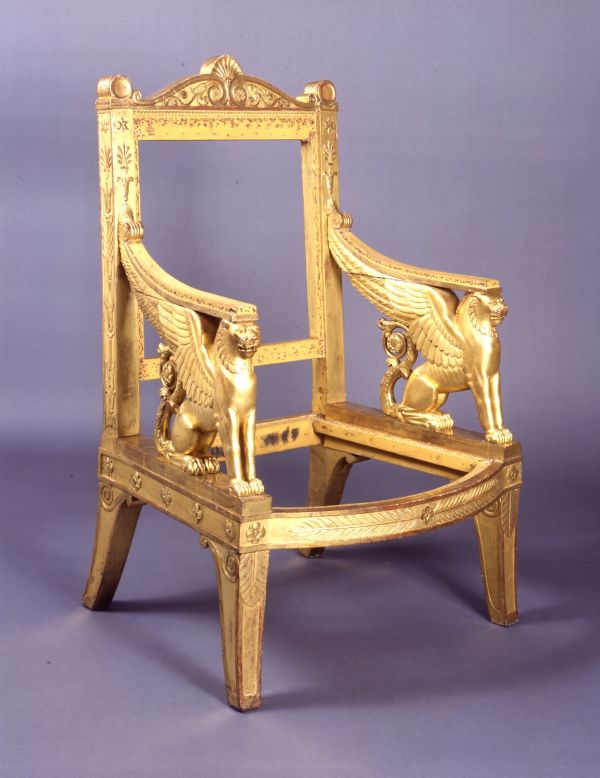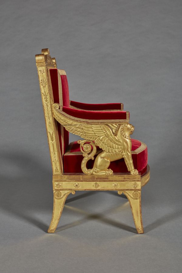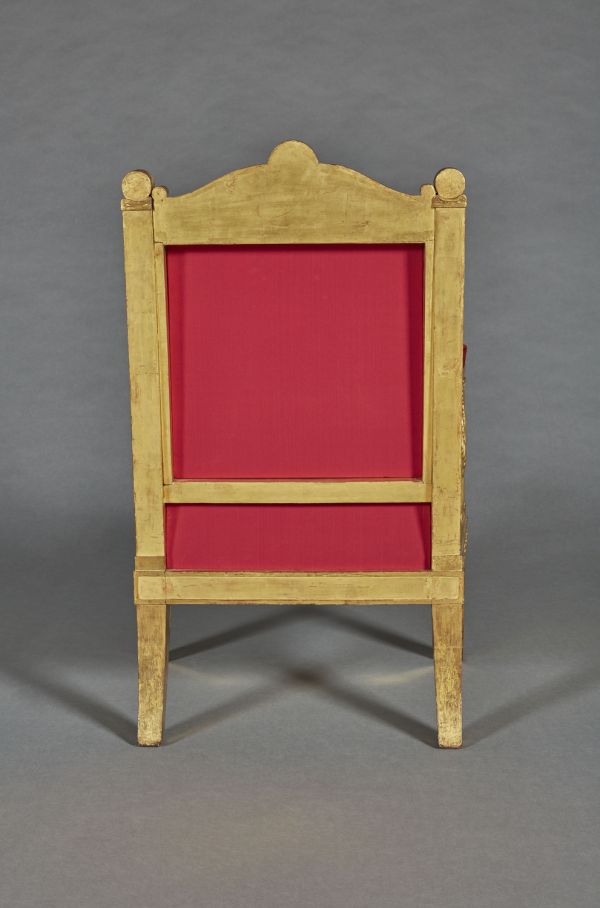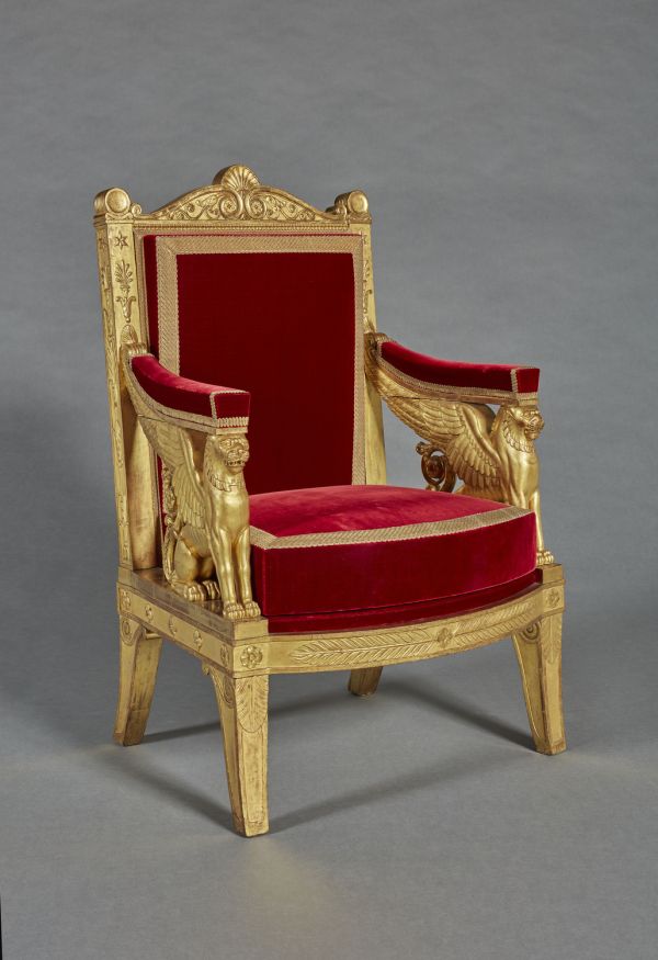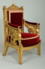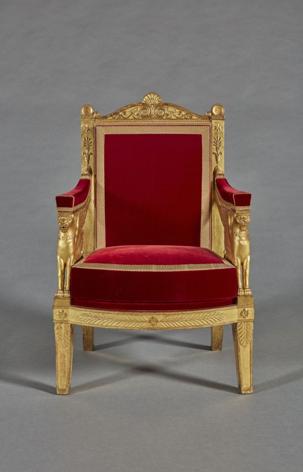Fauteuil exécuté par la société « Jacob Desmalter et Cie », association de François-Honoré-Georges Jacob, dit Jacob-Desmalter (1770-1841), et de son père Georges (I) Jacob (1739-1814), menuisiers-ébénistes, active de 1803 à 1813, sur un dessin des architectes Charles Percier (1764-1838) et Pierre-François-Léonard Fontaine (1762-1853).