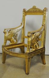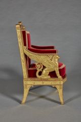 Quatre pieds sabre évasés à rouleau, côtés fond creux, sommer à rinceau, volute, les antérieurs à feuille nervée au sommet de face et fond creux. Ceinture à fond creux sans dé, côtés à cinq rosaces, devantures convexe à trois rosaces entre deux palmes. Supports d'accotoirs formés d'un lion ailé, accroupi, la queue en rinceau de feuilles et un rouleau à volute surmonté feuille au raccord terminant les ailes. dossier fond creux sur les côtés à chûte de culots palmettes et feuilles, le sommet à étoile et terminé en cylindre nervé face concave, fronton formant traverse supérieure en double doucine, extrémités à volute, centre en coquille demi-circulaire et rinceaux, rosaces et culots, base rais de coeur. Dossier, manchettes à épaisseur, siège à coussin mobile. Velour de soie rouge, galons or, clous touchants.
