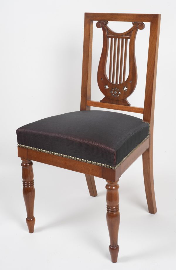 Décrite en 1855, dans une suite de cent-neuf chaises à lyre, au Garde-meuble, dans le magasin du matériel des fêtes (Arch. Mob. nat., M55-1, f° 129 v°, n° 1642).