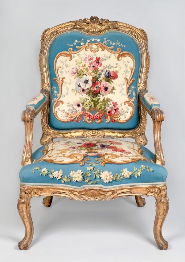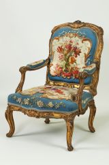 Fauteuil exécuté vers 1867 d'après un fauteuil menuisé par Nicolas-Quinibert Foliot et sculpté par Toussaint Foliot, exécuté pour le salon de Madame de Pompadour au château de Crécy, conservé dans les collections du Garde-meuble depuis 1848 (GMT 14053/1).
