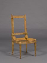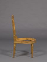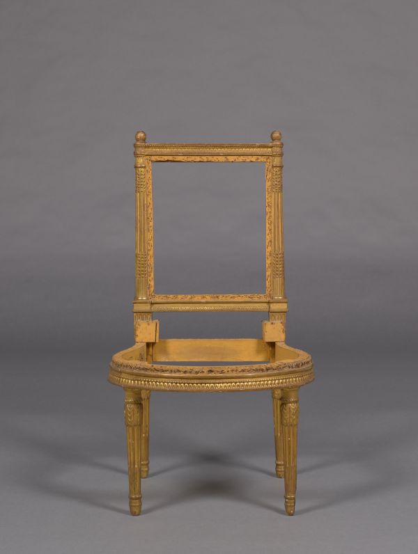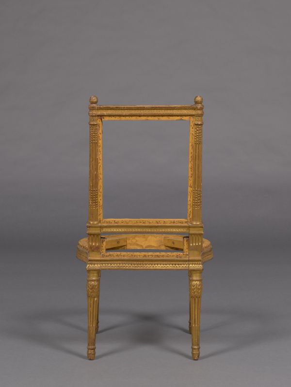 Dossier rectangulaire dégagé. Montants tournés, cannelés et rudenturés à chandelles perlées ; à nouveau, rudentures à chandelles perlées au-dessus du raccord ; pseudo-chapiteau cylindrique à feuilles entre deux bagues nues ; pomme de pin au sommet. Traverse inférieure sculptée d'une frise de rais de coeur sous une partie nue. Traverse supérieure sculptée d'une frise de rais de coeur entre deux rangs de perles et dessus azuré ; extrémités tournées saillantes sous la pomme de pin.