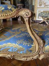 Acheté par le Garde-meuble en 1863 à la vente Séchan, et couvert après cette date du meuble n° 15 de la manufacture de Beauvais, "Style Louis XV, fond blanc, bordure bleue, fleurs et ornements" d'après Chabal-Dussurgey.