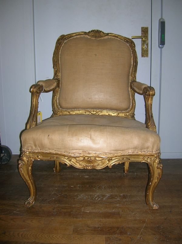 Bois doré. Quatre pieds galbés, tête à acanthes dissymétriques. Ceinture chantournée, côtés et devanture en doucine. Support d'accotoirs en retrait, débillardés. Accotoirs droits, à raccord en feuilles d'acanthe, légèrement concave, tête débillardée à volutes, moulures très creuses. Dossier carré, dégagé, très chantourné, à coquille centrale à la traverse supérieure, la moulure générale renverse la moulure vers l'arrière. Siège, dossier, à épaisseur, manchettes à pelote.