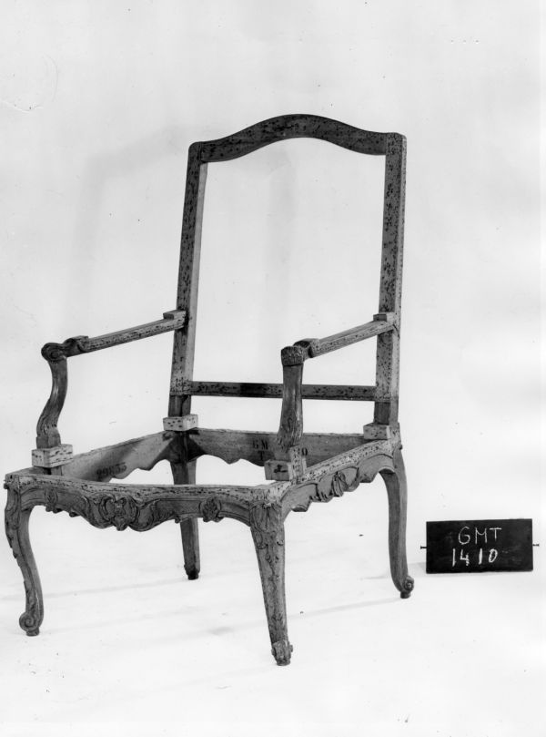 Acheté par le Mobilier national, le 27 juin 1862, dans une suite de six, à Paul Recappé (1825-1898), marchand de curiosités et d'objets d'art, domicilié rue du Bac à Paris, tenant boutique au 9 passage Sainte-Marie, actuellement 9 rue de Richelieu (Arch. Mob. nat., M238, f° 23 v°, n° 29833). L'achat comprend également six chaises en suite (n° 29832).