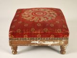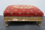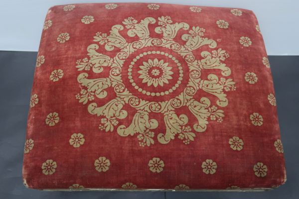 Tabouret garni en rouge, parsemé de fleurs dorées. Motif central de couronnes successives, une fleur au milieu.