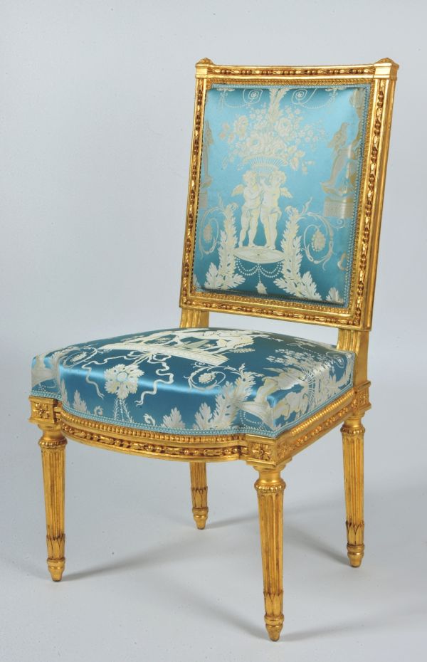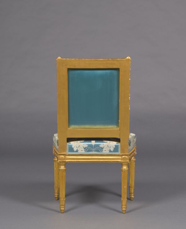Une étiquette "Grand cabinet de Monsieur", encore lisible sur certains sièges de la série, indique une livraison pour le comte de Provence, au Petit Luxembourg, avant 1781.