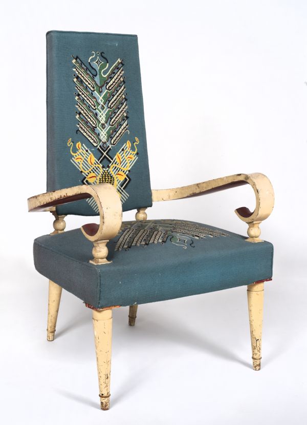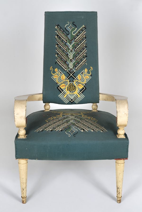 Achat à Maxime Old, le 12 mai 1943, au sein d'un ensemble composé d'un canapé, quatre fauteuils, deux chaises (GMT 14315, GMT 14316, GMT 14317), une vitrine et un guéridon (GME 9917 et GME 9918).