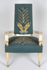 Quatre pieds tournés en gaine, les antérieurs à tailloir carré. Ceinture recouverte demi-circulaire aplatie, devanture convexe. Supports d'accotoirs en sphère entre deux évasements carrés. Accotoirs à plat cintrés élargis au centre, tête en demi-volute dessus concave. Dossier dégagé recouvert plus étroit au sommet base en doucine sur deux sphères. Siège et dossier à épaisseur.