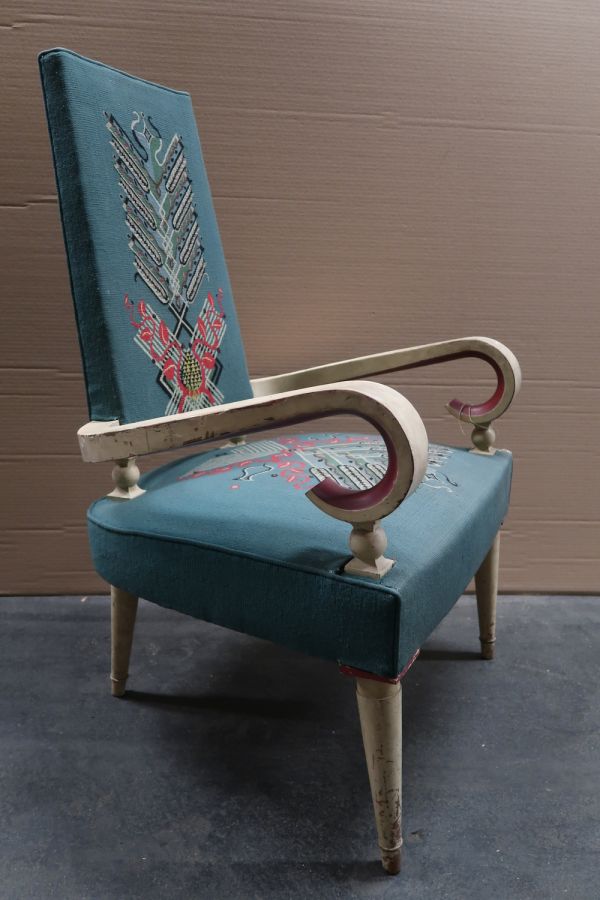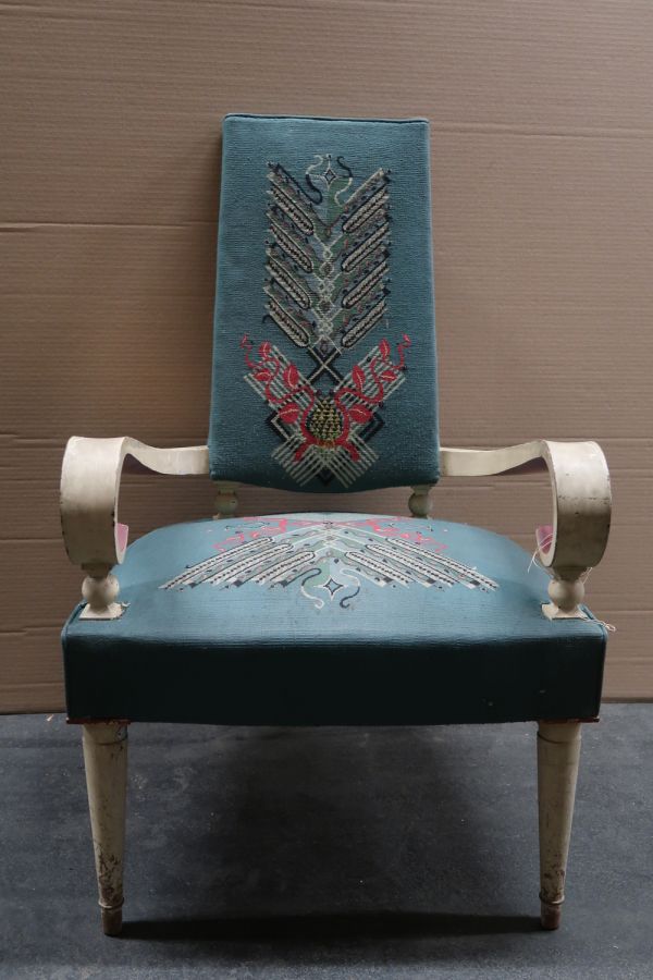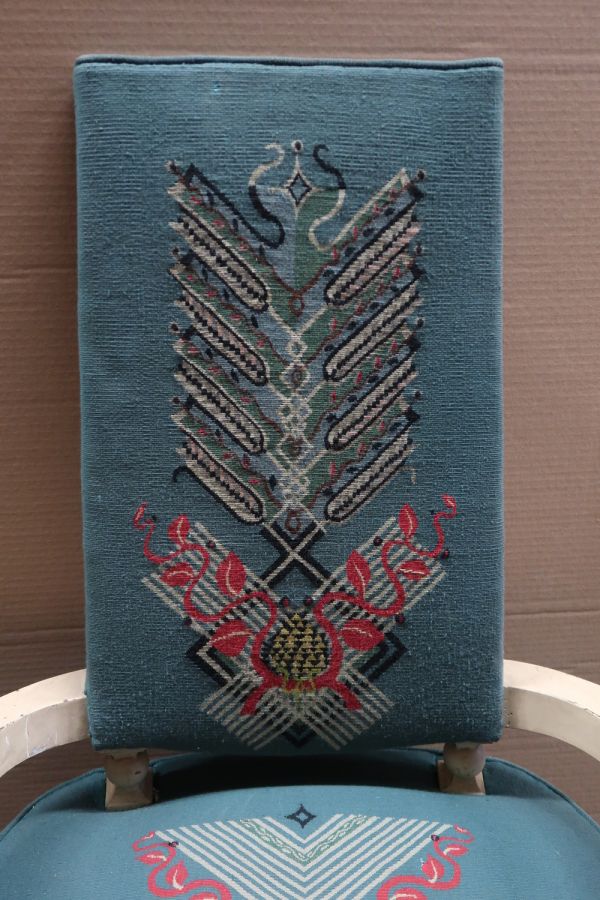 Garniture : tapisserie d'Aubusson bleu vert à motifs géométriques formant des entrelacs de flèches ou d'épis de blé en diagonale.