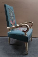 Décorateur à la production abondante et variée, actif des années 1930 aux années 1980, Maxime Old (1910-1991) fut qualifié de « trait d’union entre la grande époque des décorateurs et les temps modernes » (Y. Badetz). Le Mobilier national lui passa des commandes nombreuses et régulières entre 1941 et 1955 : plus de 180 meubles dessinés par lui sont inscrits à ses inventaires. Pendant la période de la guerre, les meubles de style Empire ou Louis XVI alternent avec des réalisations plus originales (GME 9355 et suiv., GME 9832, GME 9917) et deux ensembles en tapisserie (GMT 14315 et suiv. ; GMT 15116).