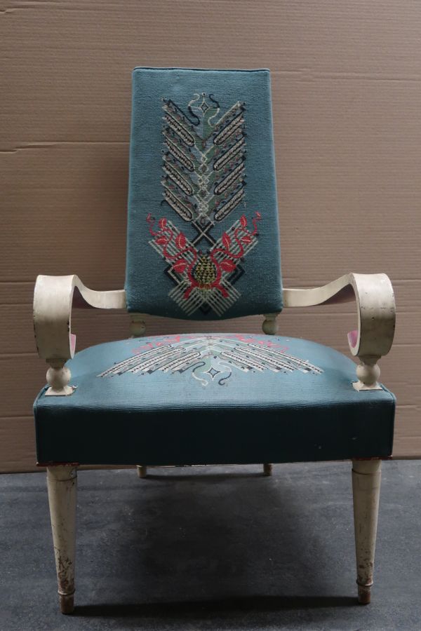 Garniture : tapisserie d'Aubusson bleu vert à motifs géométriques formant des entrelacs de flèches ou d'épis de blé en diagonale.