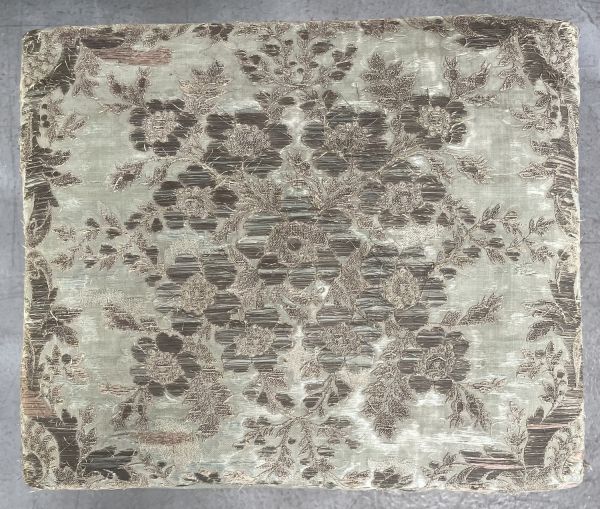 Siège à épaisseur sans ressorts. Couverture de soie à décor or et argent sur fond satin bleu : motifs floraux rayonnant dans un réseau de rinceaux végétaux et entourés par des feuilles d'acanthe.