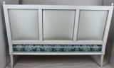 Dossier rectangulaire dégagé. Montants et traverses à fond creux avec frise d'entrelacs. Dés de raccordement supérieurs à fond creux avec rosace. Montants terminés par deux boutons côtelés.