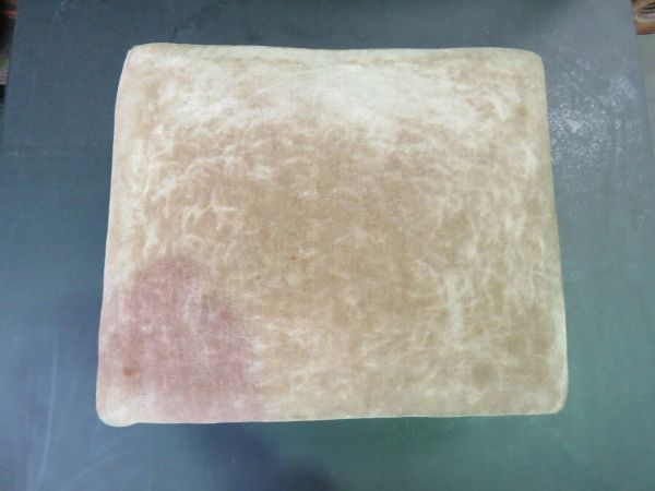 4 pieds miche. Ceinture unie sans dé. A épaisseur, sans ressorts. velours de laine beige.