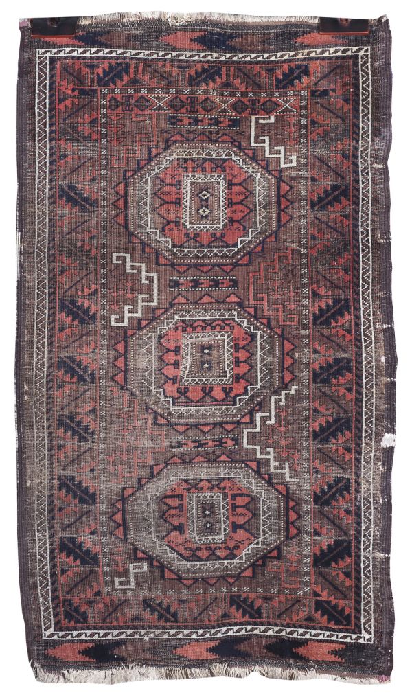Boukhara. Tapis à fond marron et motifs décoratifs géométriques rouges, noirs et blancs.