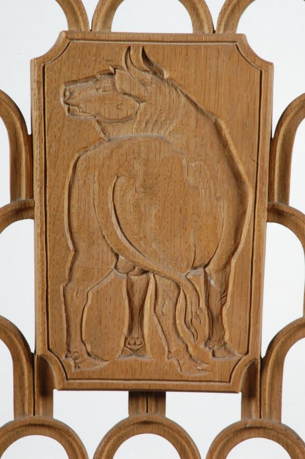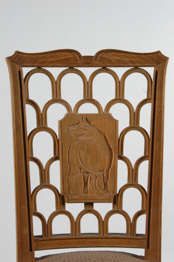 Pieds antérieurs à section carrée, à fond creux sculptés ; pieds postérieurs sabre à fond creux, entrejambe en double T. Ceinture carrée avec devanture à fond creux sculptée, et dés à rosace. Dossier concave évasé, avec encadrement à fond creux et listels arrondis ; la traverse supérieure chantournée, le panneau central découpé, ajouré d'arcades, avec au centre un panneau représentant un signe du Zodiaque (taureau).
