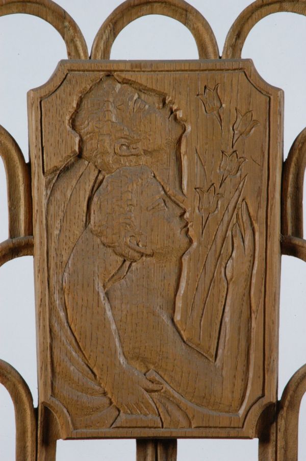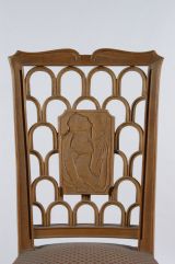 Pieds antérieurs à section carrée, à fond creux sculptés ; pieds postérieurs sabre à fond creux, entrejambe en double T. Ceinture carrée avec devanture à fond creux sculptée, et dés à rosace. Dossier concave évasé, avec encadrement à fond creux et listels arrondis ; la traverse supérieure chantournée, le panneau central découpé, ajouré d'arcades, avec au centre un panneau représentant un signe du Zodiaque (gémeaux).