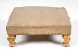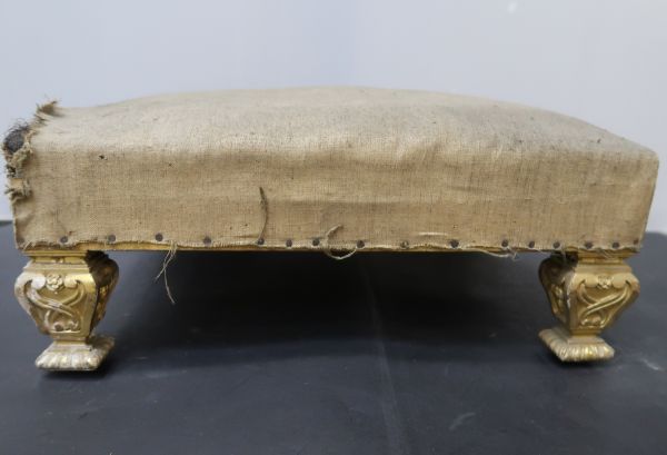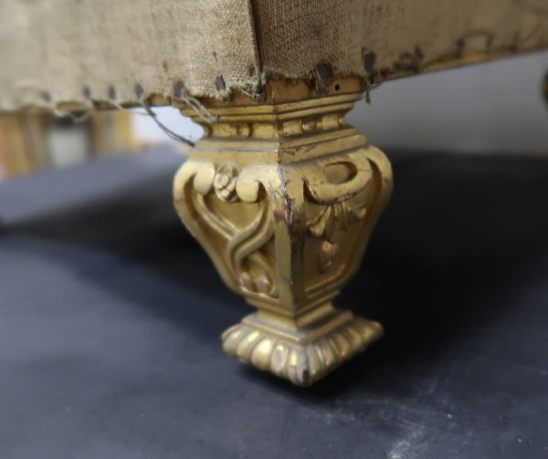 Bois doré. 4 pieds carrés, chantournés en poire, les faces creuses à 2 rinceaux en S sur sabots moulurés, à godrons. Ceinture carrée recouverte. Siège à épaisseur, sans ressorts. Garni en blanc.