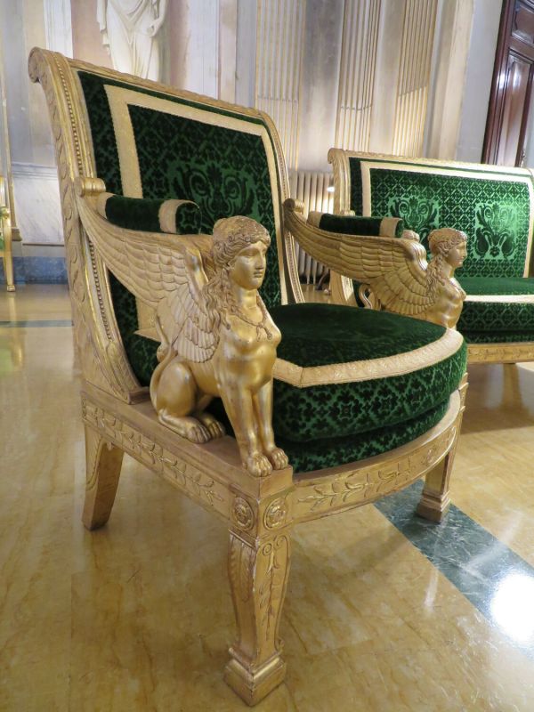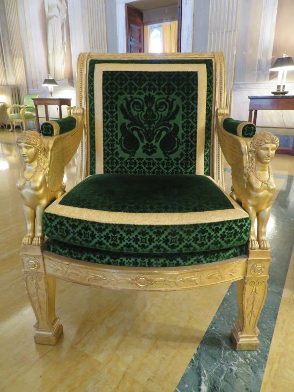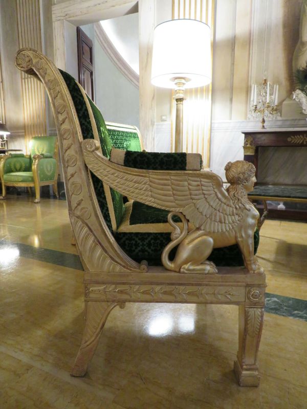 Pieds antérieurs chantournés à section rectangulaire. Pieds postérieurs sabre. Sphinges ailés formant supports et accotoirs. Ceinture carrée, devanture convexe. Montant en doucine s'enroulant, traverse supérieure droite à frise de branches de roses stylisées. Décor sculpté en fond creux : tiges de feuillages, feuilles d'eau, perles, rosaces. Velours de laine gaufré vert