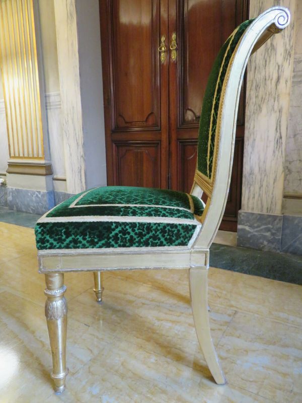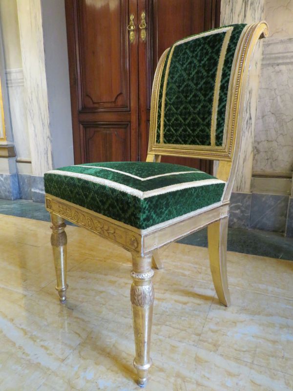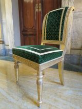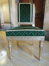 1820 : cannetillé vert, double encadrement bordure brocart vert et or, une seule au dossier.