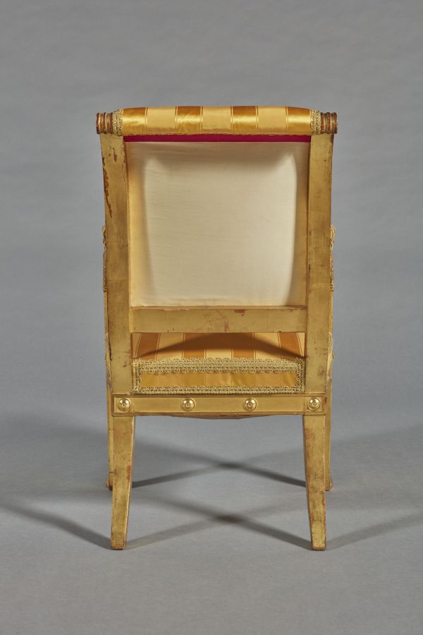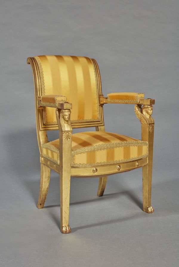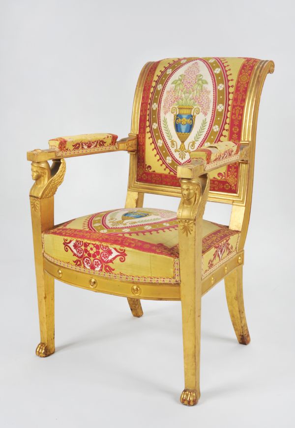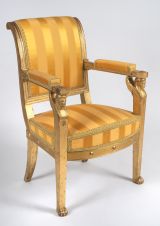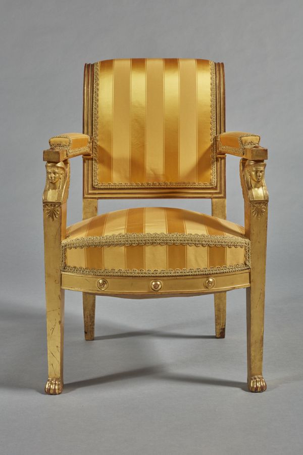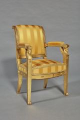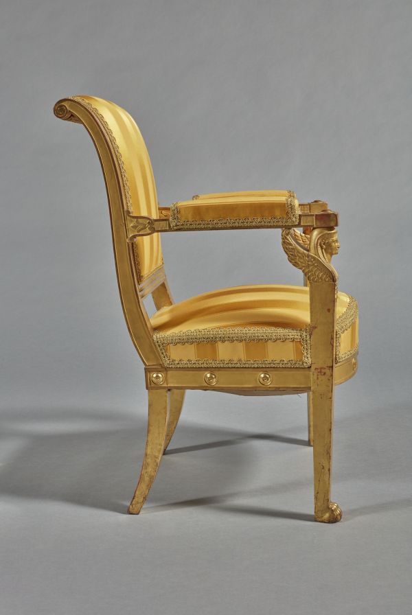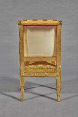 Bois doré. Pieds antérieurs carrés en gaine, formant supports d'accotoirs, sabots à griffes de lion, sommet tête de sphinx ailé. Pieds postérieurs sabre. Ceinture fond creux sans dé, devanture convexe, toutes les faces à 3 macarons. Accotoirs droits, tête carrée, dessus macaron, azurs dessus et côtés, raccord en doucine symétrique à rouleau, côtés à culot et volutes. Dossier dégagé, montants en doucine à rouleau et volutes, face à 3 listels, côtés fond creux. Traverse supérieure recouverte. Siège et manchettes à épaisseur, dossier à pelote. Soierie jaune à motif central en ove à festons concaves et listels rouges, autour d'un vase bleu et or portant 3 lilas.