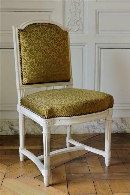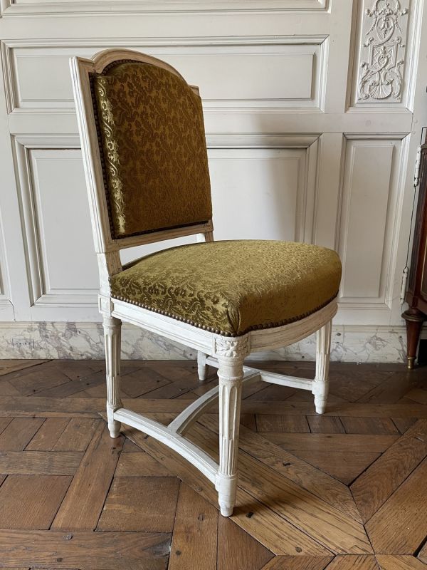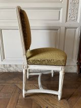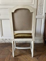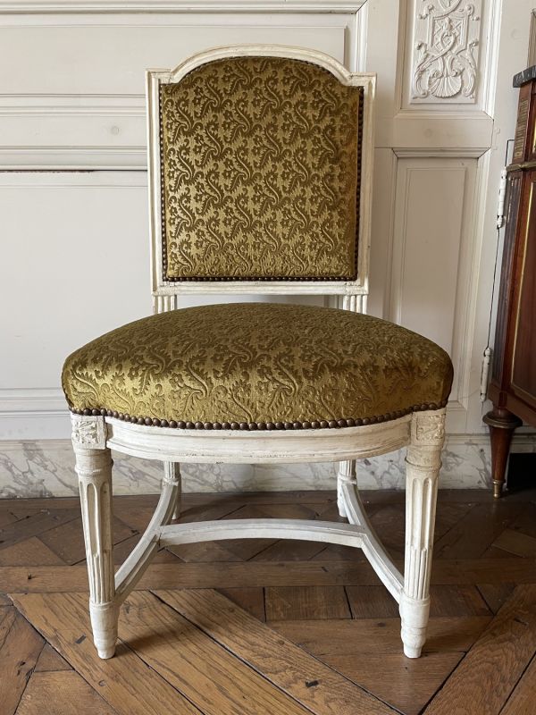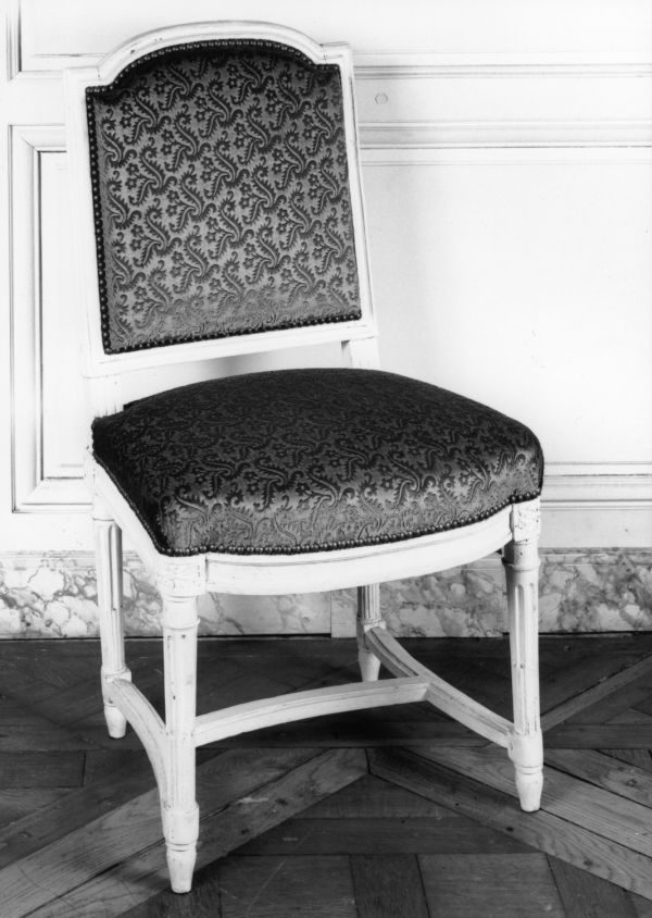 Pieds tournés, cannelés, rudentés, sur poire effilés, réunis par entrejambe en double T cintré et mouluré. Ceinture carrée, moulurée, devanture en anse de panier convexe, dés en coins ronds à rosaces en façade et en carrés à pointe de diamant arrière. Dossier carré, mouluré, traverse supérieure en anse de panier, les extrémités droites. Siège et dossier à épaisseur sans ressort.