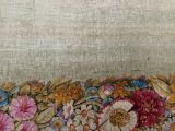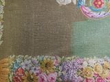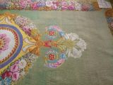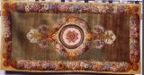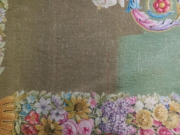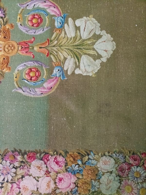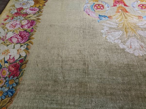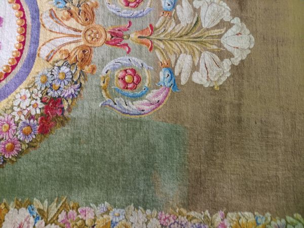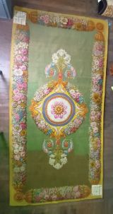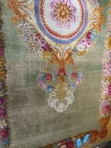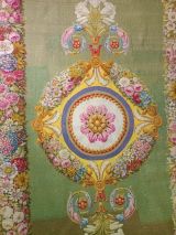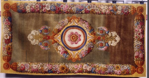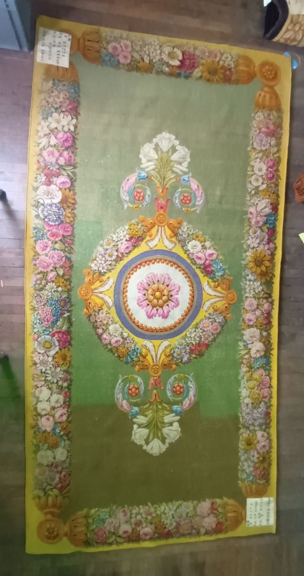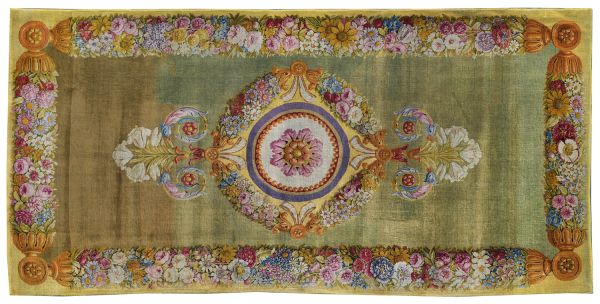 Tapis Restauration fond vert, médaillon circulaire central, marqué d'une rosace ton deux ors et feuilles roses, encadrée d'un cordon perlé et de listels rouge, beige, violet. Médaillon entouré de guirlandes de fleurs multicolores, se prolongeant à deux extrémités en gerbes de fleurs de lys blanches et feuilles d'acanthe multicolores. Encadrement général aux extrémités du tapis : faisceaux de fleurs multicolores, séparées par des médaillons dorés et se détachant sur fond jaune.