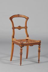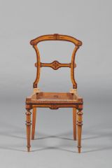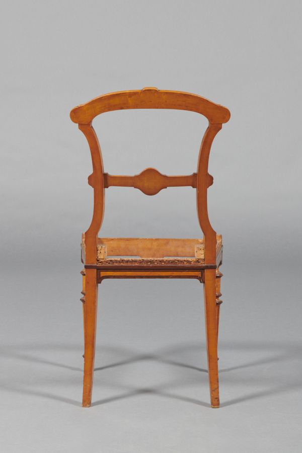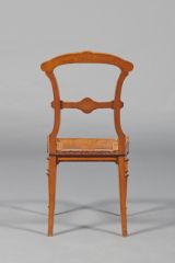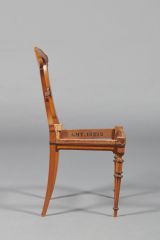 Quatre pieds ; pieds antérieurs en érable blanc tournés, fuselés et cannelés avec bagues en amarante saillantes ; ceux-ci surmontés d'un dé saillant avec coin externe en quart-de-rond, marqueté d'une frise en érable gris et filet amarante sur fond en érable blanc ; pieds postérieurs sabre marquetés en érable blanc. Ceinture chantournée en arc aux extrémités des traverses, celles-ci marquetées d'une bordure avec frise en érable gris et filet amarante sur fond en érable blanc sur toutes les faces ; devanture convexe et chantournée avec marqueterie en amarante à motif de deux grecques entrecroisées et symétriques au centre. Dossier en cabriolet très dégagé à montants et traverses, ceux-ci marquetés en érable gris et filet amarante sur fond en érable blanc en façade et marqueté en érable blanc au dos ; montants chantournés en anse de panier, traverse intermédiaire chantournée avec centre saillant haut et bas et marqueté d'un motif de rosace en amarante, traverse supérieure chantournée en arc avec extrémités saillantes marquetées d'une volute et centre marqueté de 2 grecques entrelacées en symétrie.