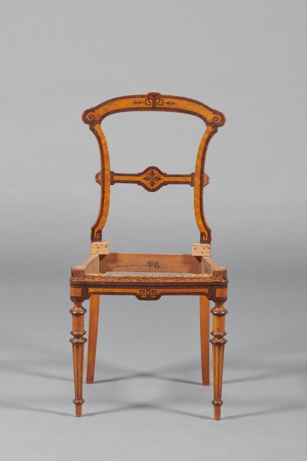 Chaise en bois verni ; bois massif, marqueterie et incrustations en érable blanc, érable gris et amarante.