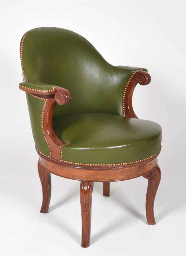 4 pieds en doucine sommet feuilles d'eau et volute champ arrondi. Ceinture circulaire, listel arrondi à la base, petite moulure à la partie tournante. Supports d'accotoirs en cavet chantournés, concaves à l'intérieur très en retrait, tête à volutes, feuille d'eau. Rampe en doucine et manchettes plates très saillantes à listel bois ; entièrement recouvert 1 seul listel arrondi à l'arête de la rampe, garni à épaisseur. Dossier à pelote.