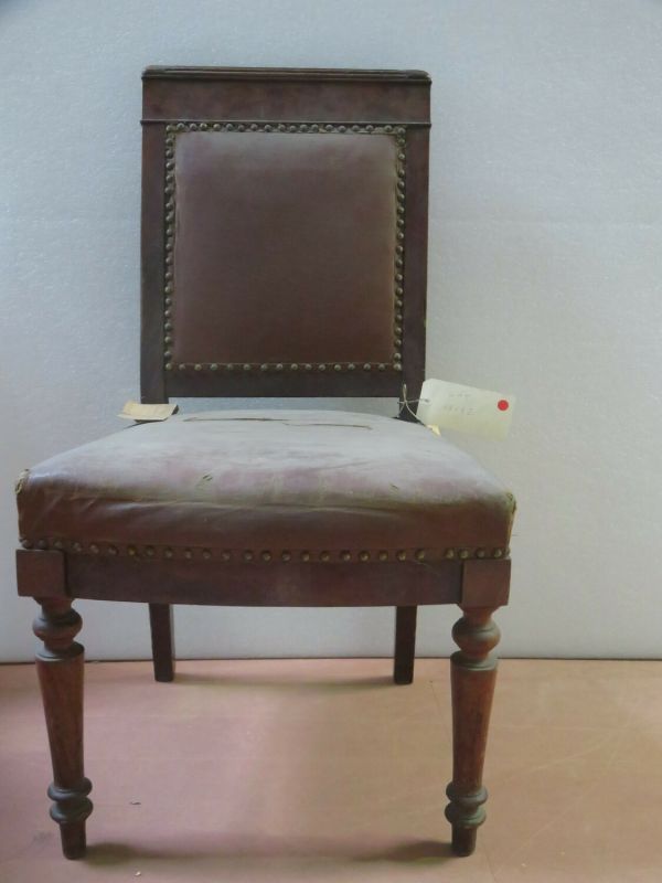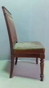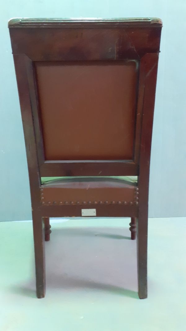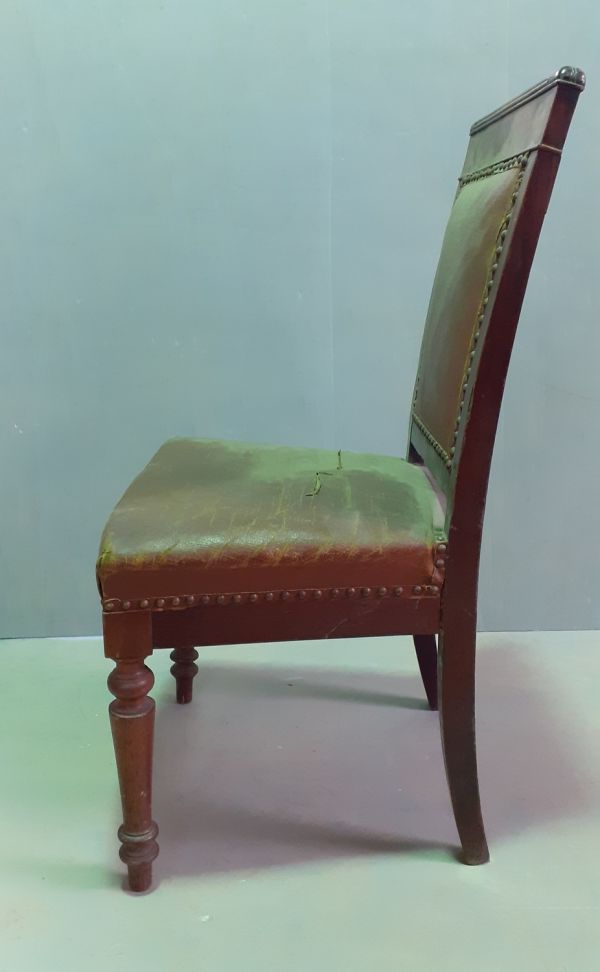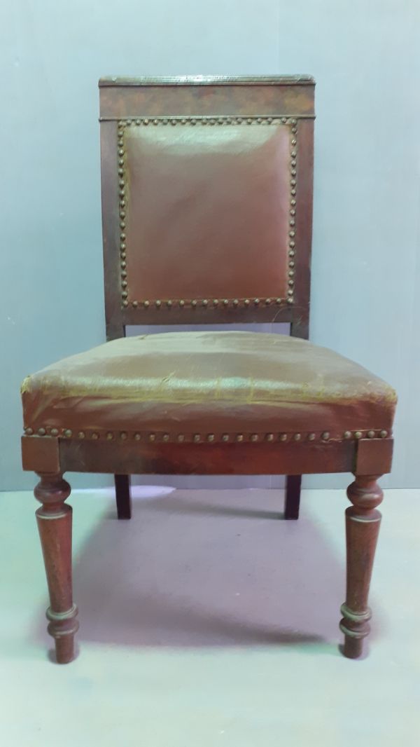 chaise acajou 1ère moitié XIXe, pieds avant tournés bagués, pieds arrières en sabre filant avec le dossier, dossier carré à large traverse supérieure moulurée, fond et dossier garnis de moleskine marron avec un galon.