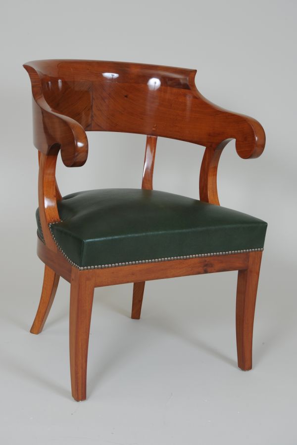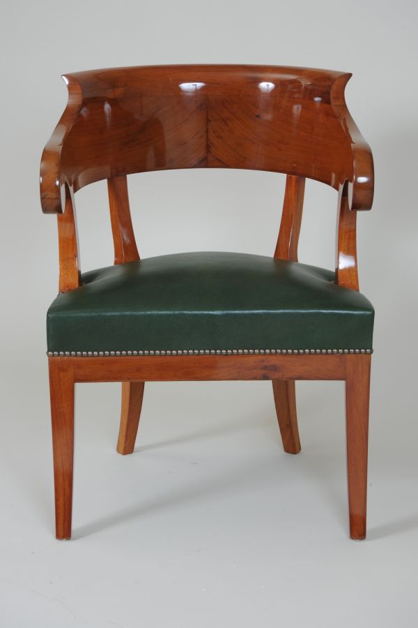 4 pieds sabre. Ceinture demi-circulaire, unie, sans dés. Supports d'accotoirs en retrait et en cavet, rampe chantournée en rouleaux formant tête; derrière incliné, un croissant sur montants concaves. Siège à épaisseur sans ressorts. Moleskine verte.
