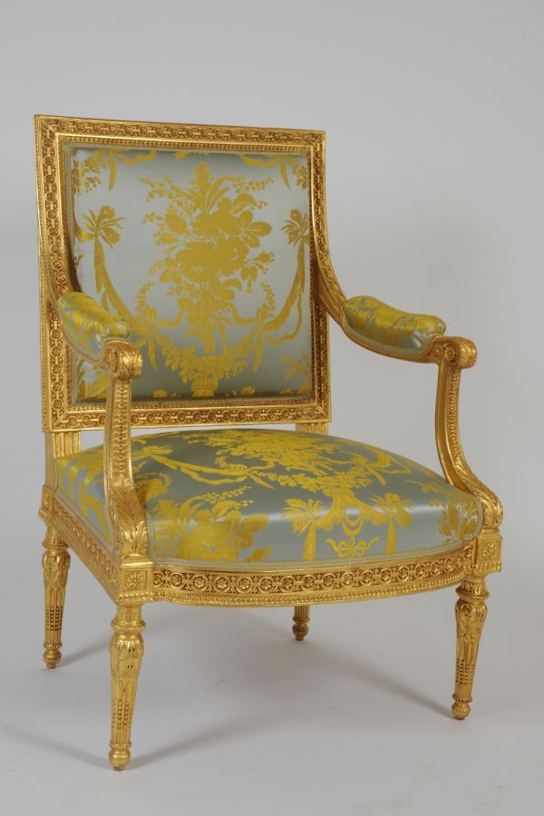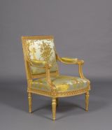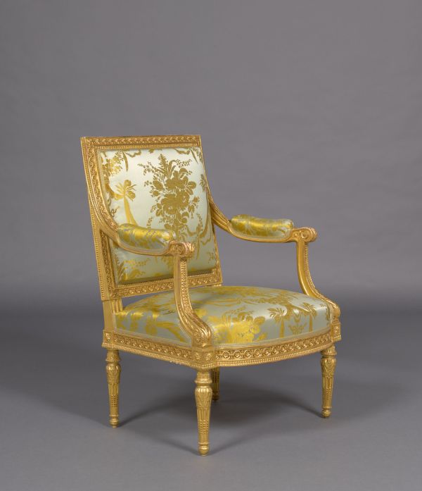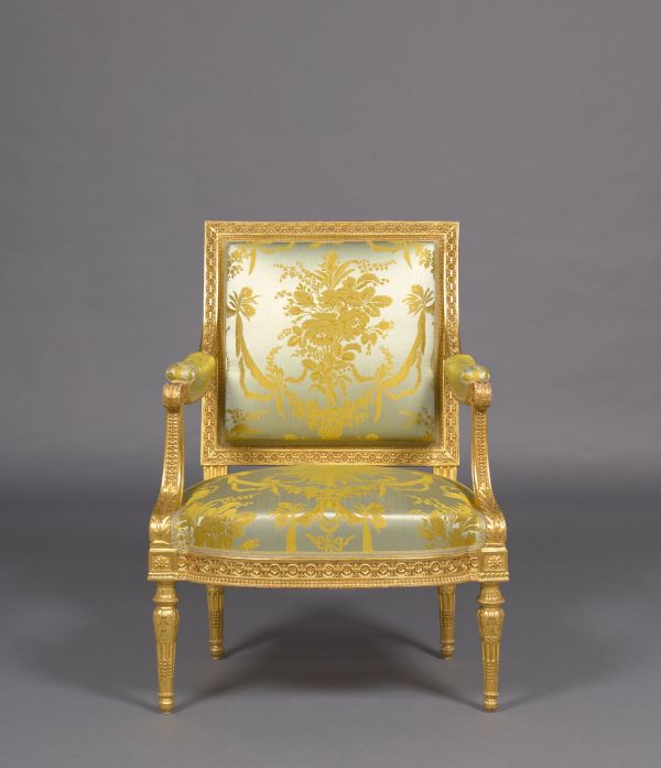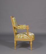 D'un ensemble de salon comprenant à l'origine dix fauteuils à la reine, quatorze fauteuils en cabriolet, six chaises, deux causeuses, six voyeuses et deux paravents, exécuté vers 1784 pour Joseph-Hyacinthe de Paule de Rigaud, comte de Vaudreuil (1740-1817), grand fauconnier de France.