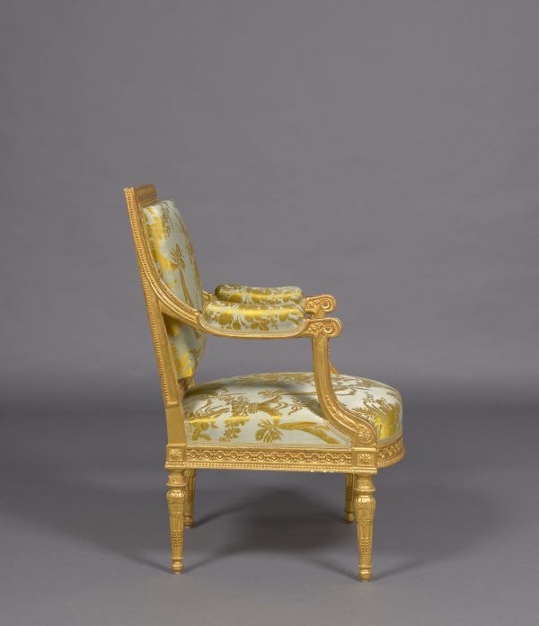 Acheté en 1788 par le Garde-meuble de la Couronne au comte de Vaudreuil. La même année, les dix fauteuils à la reine, six cabriolets, les six chaises, les deux causeuses et les deux voyeuses figurent dans le grand salon de Marc-Antoine Thierry de Ville-d'Avray, intendant général du Garde-meuble, à l'hôtel du Garde-meuble, place Louis XV.