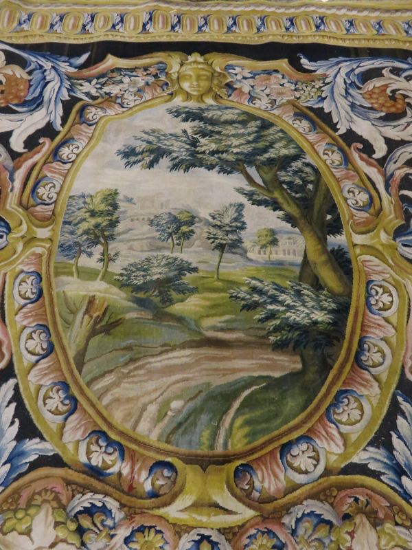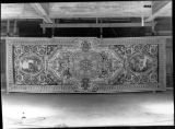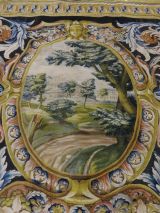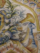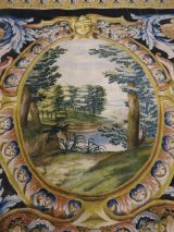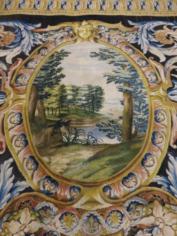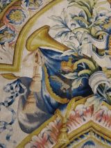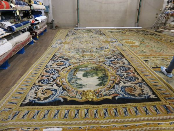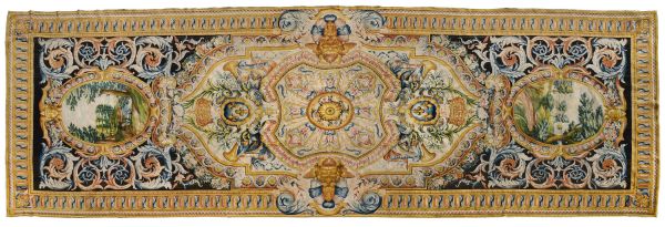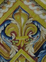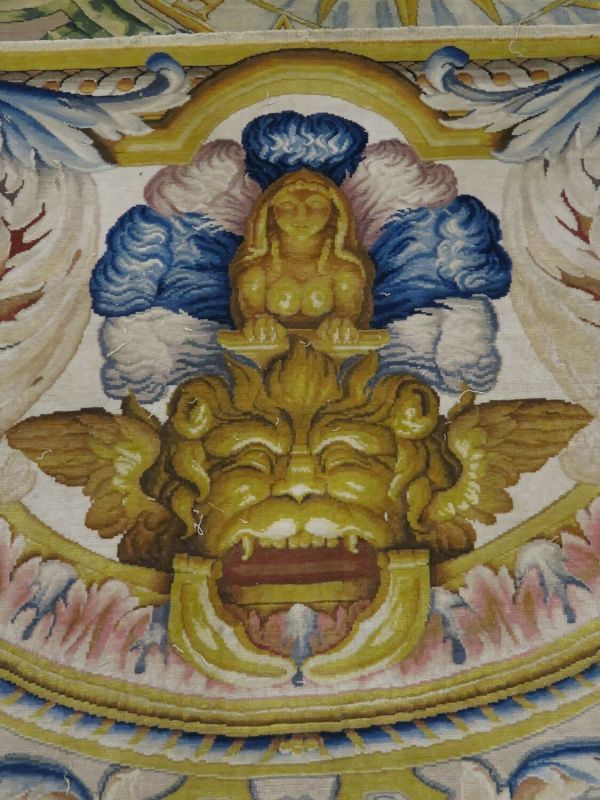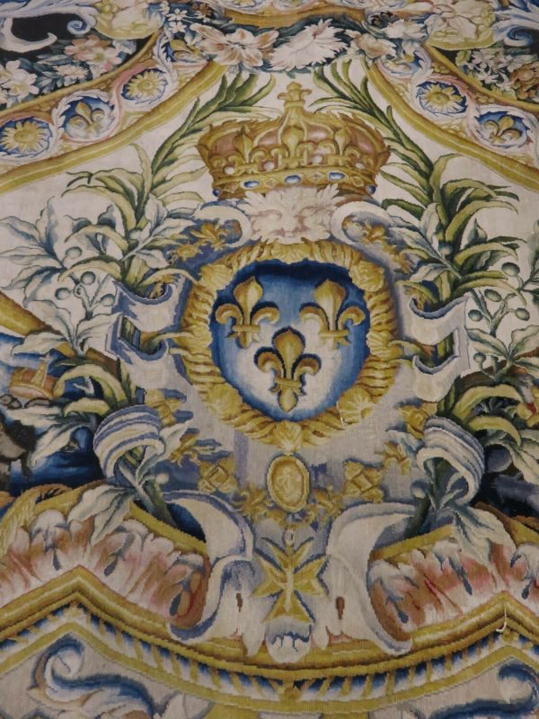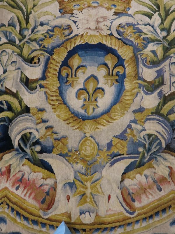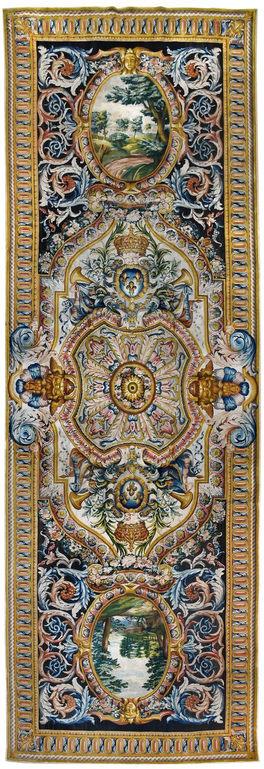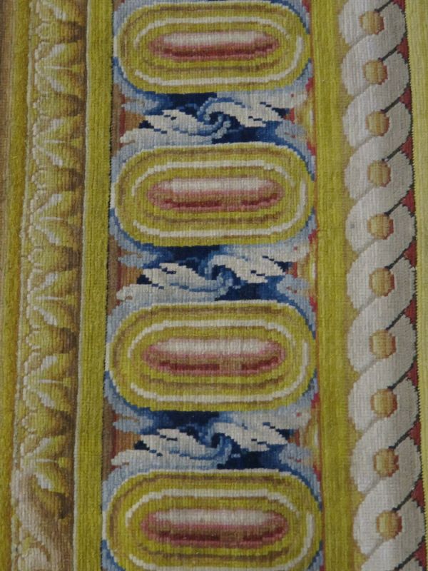 Motif central ovale à 4 rentrées concaves à bordure d'acanthes roses sur moulure or, centre à rosace or entouré de roses et une moulure or ovale pourtour à fond rose et motif de culots décanthes roses et bleus en étoile. Sur le fond du caisson, aux extrémités, écusson bleu à 3 fleurs de lys or, coiffé couronne or à fond rose et sur attributs guerriers chapeaux et troupes entre palmes, et aux deux axes gueule de lion or, portant sphinge or sur flammes bleues et roses. A chaque extrémité ovale à moulure or et décor de feuilles roses et cercles bleus alternés, encadrement paysage vert. Sur le reste du tapis rinceaux en volutes d'acanthes bleus et roses.