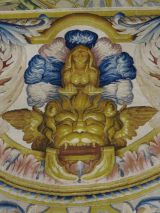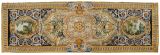 Fond général noir. Caisson central allongé à fond blanc, les extrémités en double doucine à centre en double volute adossées contre les grands côtés et bordées de rosaces et fleurs de lys or, alternées sur fond bleu et serties de 2 sinusoïdes d'acanthes roses et blanches, entre deux moulures or.