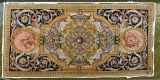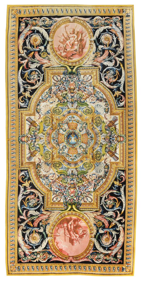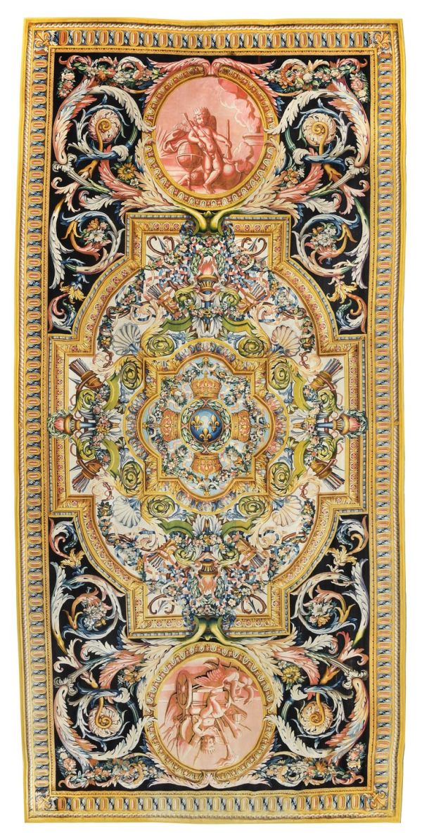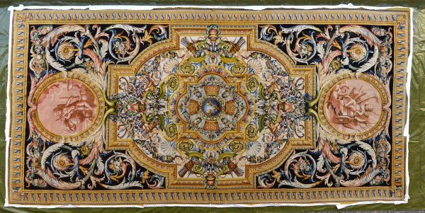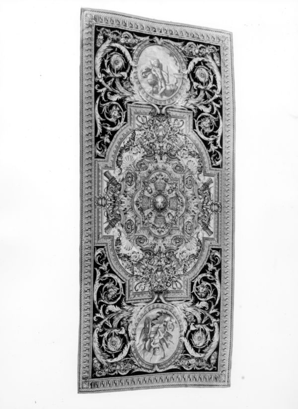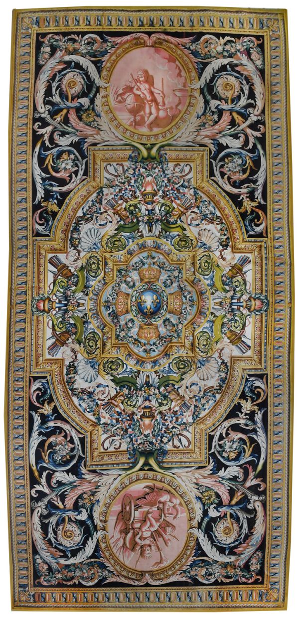 Centre aux armes de France, globe fleurs de lys et 4 couronnes royales tenues par guirlandes de fleurs dans un motif de forme carrée, soutenu par 4 ensembles carquois et flambeaux au milieu de guirlandes de fleurs. Encadrement moulure vieil or avec coins ronds rentrants ; aux extrémités 2 médaillons circulaires, avec enfant et attributs représentant l'le triomphe et la force de l'Amour, sur fond sanguine, entourés de rinceaux et guirlandes sur fond noir. Bordure d'oves allongés raies de coeur et entrelacs vieil or à galon or.