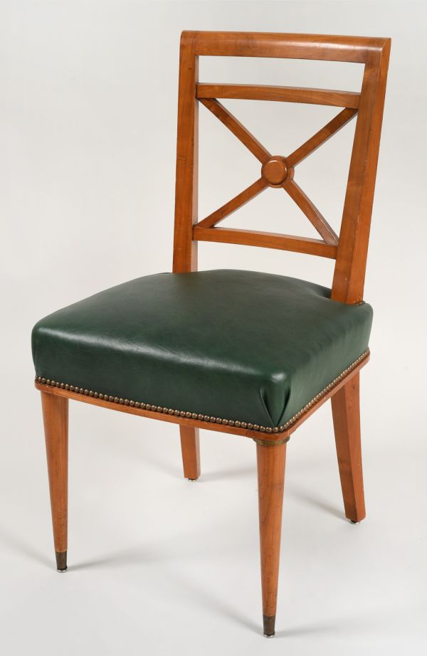 Pieds antérieurs tournés en gaine, sabot affleuré et bague supérieure ronde en bronze poli. Pieds postérieurs sabre. Ceinture recouverte sauf listel carré de base. Quatre coins ronds, devanture et arrière convexes. Dossier dégagé et concave à trois traverses, la supérieure plus large et dessus arrondi ; entre les deux inférieures, croix de Saint-André, à centre rond et pastille saillante.