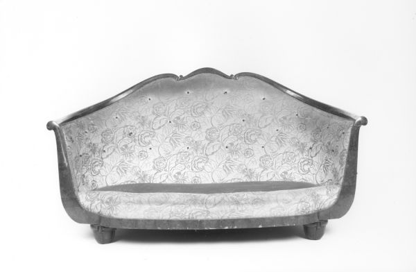 2 pieds antérieurs tournés, ovoïde côtelé, sous arrondi sculpté. 2 Pieds postérieurs sabre. Ceinture demi-ovale unie, devanture en anse de panier. Supports d'accotoirs filant avec la ceinture et raccordés à la devanture, en doucine gainée, tête en rouleau extérieur. Rampe arrondie, et chantournée en 3 doucines, la centrale étroite entre crossettes. Siège à épaisseur et coussin mobile. Dossier et côtés à pelote, garniture extérieure.