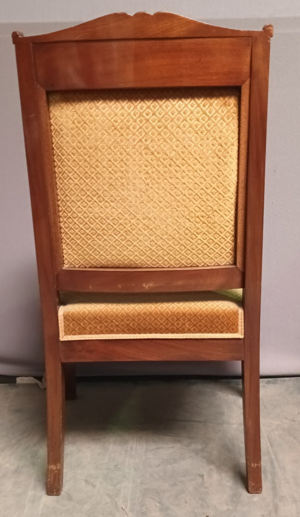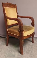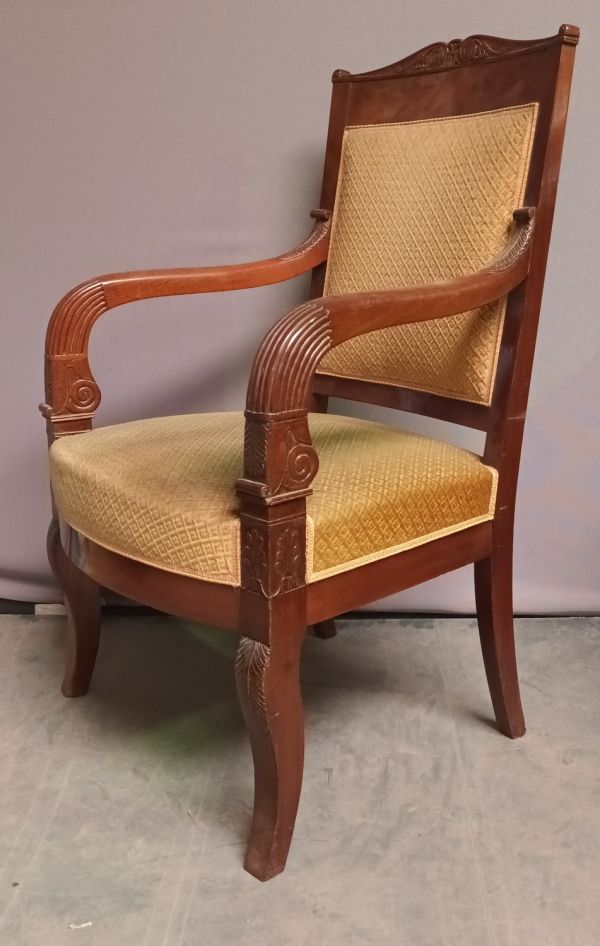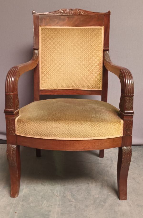 Fauteuil à pieds postérieurs en sabre et pieds antérieurs en console. Pieds en console décorés de palmes, dès de raccordement décorés de palmettes, sur la face et les côtés. Accotoirs en doucine, se terminant à la jonction avec les dès en palmes sur la face et enroulements latéraux. Accotoirs cannelés sur la courbe, à la jonction avec le dossier en palme avec léger enroulement. Dossier mouluré a un fronton triangulaire avec en son centre un double enroulement et motif de culot au milieu. Et sur les deux extrémités petits enroulements. Couvert de velours camel gaufré quadrillage et fleurettes, et galon en tissu.
